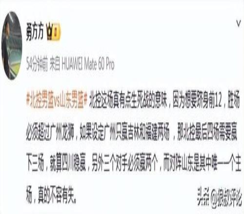 媒体人方方发文点评:“北控这场真有点生死战的意味,因为想要跻身前12,胜场必须超过广州龙狮,如果设定广州只赢吉林和福建两场 ,那北控最后四场需要赢下三场,就算四川稳赢,另外三个对手必须赢两个,而对阵山东是其中唯一一个主场,真的不容有失。 ”