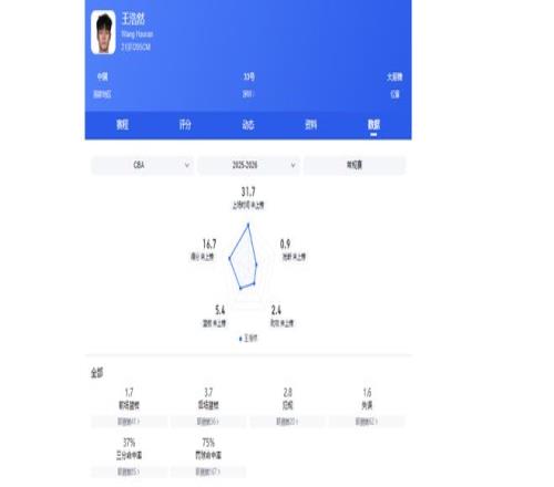 截至第38轮,王浩然也是全勤,场均出场时间31.8分钟,场均数据是16.7分5.5篮板2.4助攻,投篮命中率49.4%,个人贡献也是比较高的。