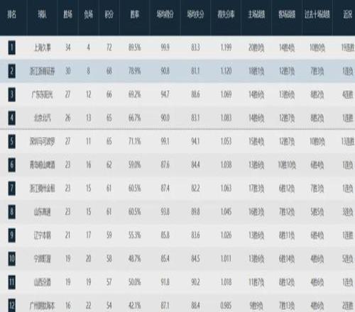 广东队目前取得27胜12负战绩排名联盟第三,仅次于上海队(34-4)和卫冕冠军广厦队(30-8),北京队26胜13负位列第四,超级黑马深圳队27胜11负第五。