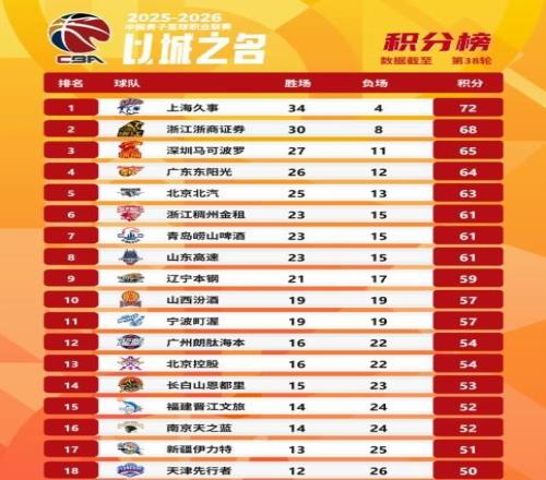 截至4月13日夜间更新的CBA积分榜显示:上海男篮以34胜4负傲视群雄,提前锁定常规赛头名;广厦与深圳分列第二、第三;广东队战绩为26胜12负,暂居第四;北京首钢则以25胜13负紧随其后,排名第五。