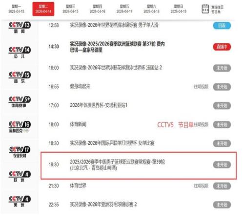 然而本次,CCTV5却打破既有节奏,依据官方最新节目单显示:4月14日19:25起,央视将全程直播北京首钢客场挑战青岛男篮的硬仗,聚焦这场直接关系季后赛排位走向的巅峰对话。