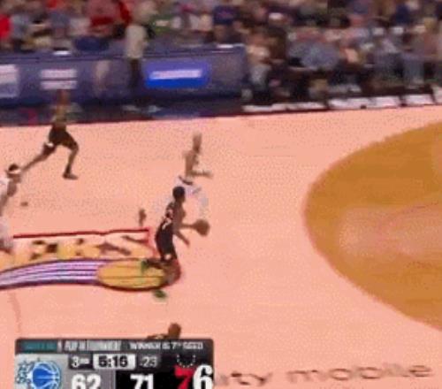 当时76人正以71-62领先,保罗·乔治眼疾手快完成抢断,一把将球甩给了快下的小老弟VJ·埃奇科姆。这位菜鸟不仅稳稳吃饼完成终结,进球后还顺带给魔术后卫杰伦·萨格斯上了一课——他几乎是用“野蛮冲撞式”的嚣张姿态,一路把萨格斯逼到了观众席边缘,嘲讽属性直接拉满。
