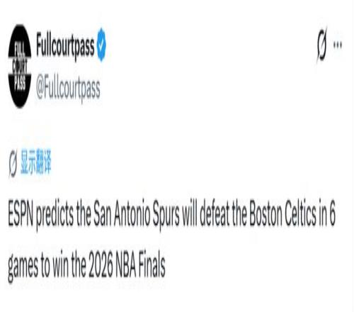 北京时间4月14日,ESPN对2025-26赛季的NBA季后赛展开全面预测,最终,他们认为马刺会成为本赛季的总冠军,他们将在总决赛4-2淘汰凯尔特人,22岁的文班亚马成为总决赛MVP。