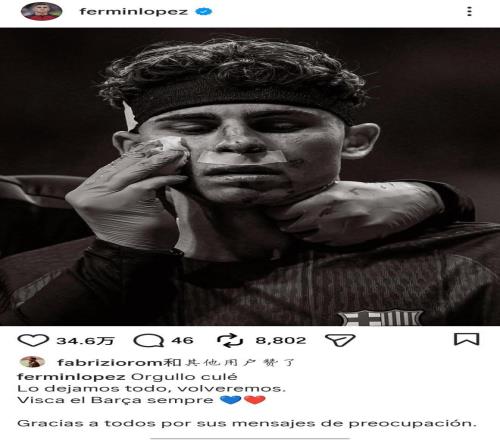 北京时间4月15日,欧冠1/4决赛次回合比赛,巴萨客场2-1马竞,总比分2-3不敌马竞无缘欧冠四强。赛后费尔明在社媒晒脸部受伤照并发文:“身为巴萨球迷的骄傲。我们付出了一切,我们会回来的。巴萨永远万岁。感谢大家发来的关心的消息。”