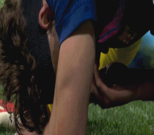 比赛第26分钟,巴萨中场费尔明被马竞门将穆索的鞋钉踢中脸部,鲜血瞬间直流,比赛甚至不得不暂停以便他接受医疗救治。在经过几分钟的处理后,费尔明便重返赛场,继续坚持比赛。