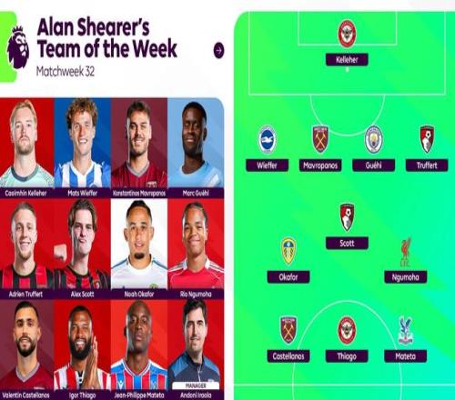 英超第32轮比赛已经结束,英格兰足坛传奇前锋希勒评选出了本轮的最佳阵容,格伊、恩古莫哈、奥卡福尔等人入选。