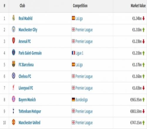 附欧洲身价前十俱乐部(单位:欧元):